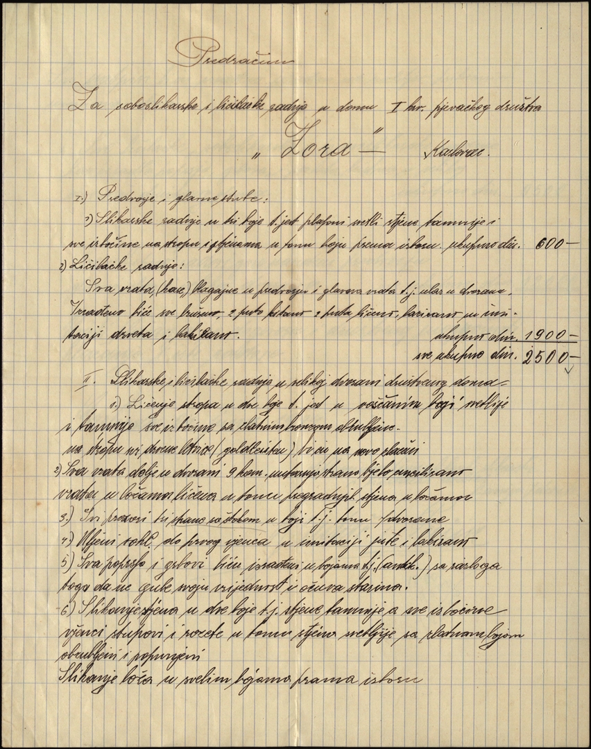 Dopis s ponudom i troškovnikom za soboslikarske radove u Zorin-domu od Bradača i Peršina
